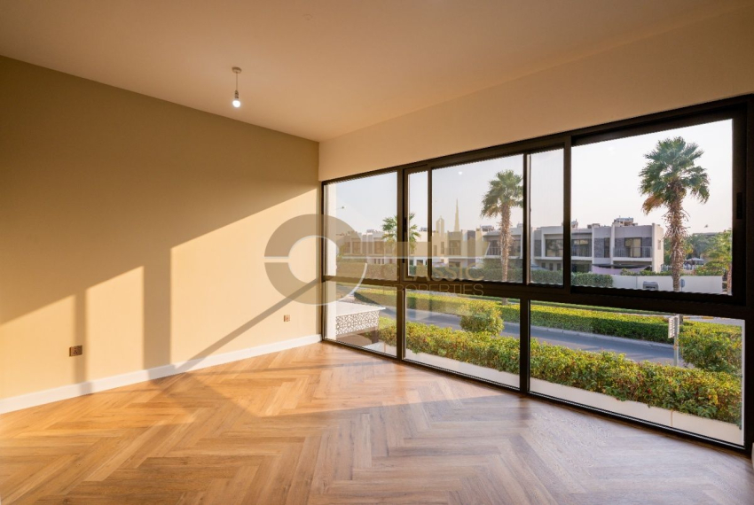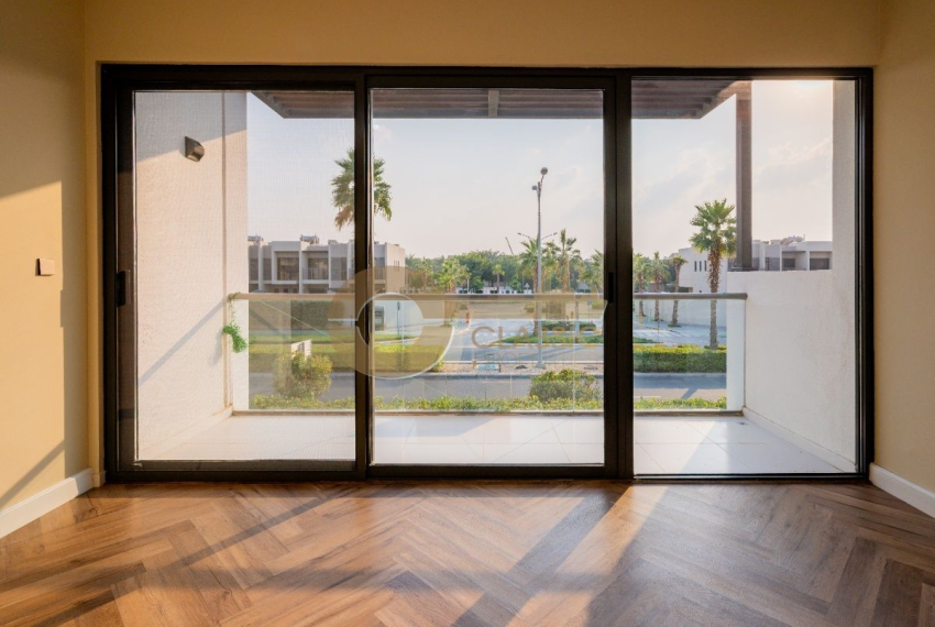 The villa features a bright open-plan living and dining area, a modern closed kitchen, spacious bedrooms with en-suite bathrooms, and high-quality finishes throughout. A private garden and terrace provide peaceful community views. Vacant and ready to move in.